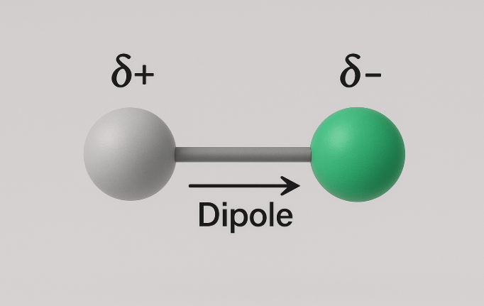 A dipole occurs when electrons in a bond are shared unequally because one atom is more electronegative than the other. This unequal sharing creates a partial negative charge (δ⁻) on one atom and a partial positive charge (δ⁺) on the other. The extent to which this charge (electron) is separated is called polarity. Ionic bonds are the most polar, and non-polar covalent bonds (such as in H2) are least, since both hydrogen atoms are identical and so they pull against each other equally.